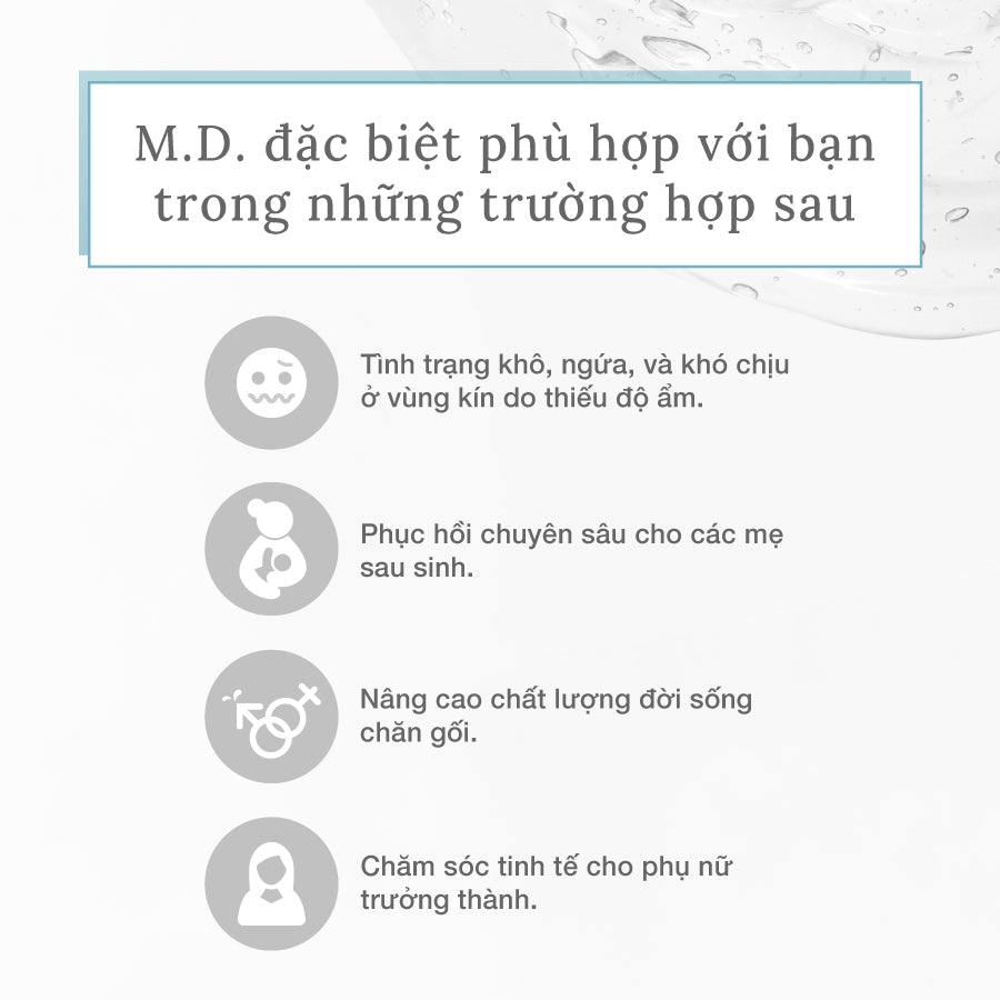 - Phụ nữ ở các độ tuổi khác nhau sẽ gặp những vấn đề vùng kín khác nhau.“MD” là gel làm sạch vùng kín đạt chuẩn y tế thẩm mỹ, tập trung vào cảm giác sạch sẽ và mùi hương dễ chịu.